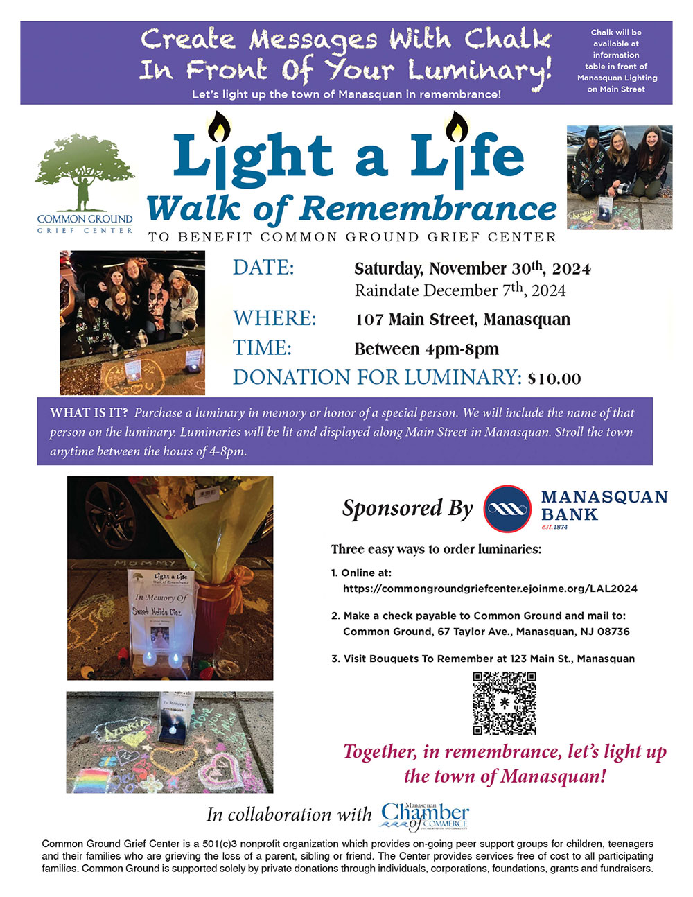 Please join us on Saturday, November 30th in Downtown Manasquan for our 9th annual Light a Life, Walk of Remembrance sponsored by Manasquan Bank. Let’s light up the town of Manasquan in remembrance!