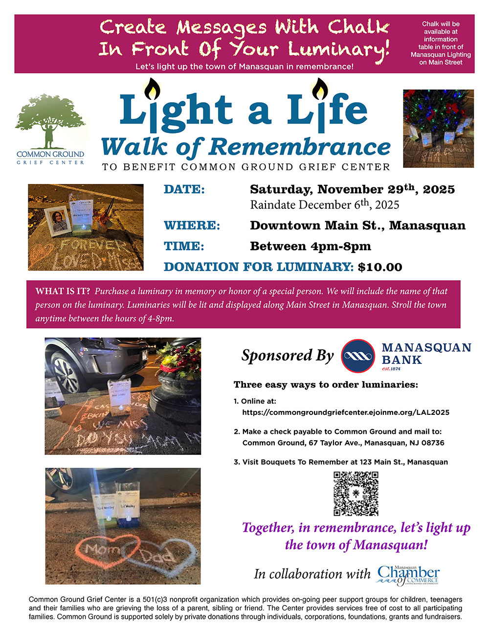 Light A Life, Walk of Remembrance – 11.29.25 Posted by Lynn Snyder on September 4, 2025 Please join us on Saturday, November 29th in Downtown Manasquan for our 10th annual Light a Life, Walk of Remembrance sponsored by Manasquan Bank. Let’s light up the town of Manasquan in remembrance! CLICK HERE TO REGISTER CLICK HERE TO REGISTER